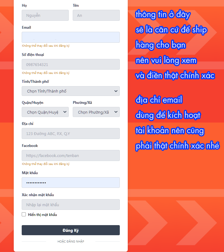 LƯU Ý: ĐÂY LÀ THÔNG TIN ĐỂ SHOP CĂN CỨ SHIP HÀNG CHO BẠN, NHỮNG MỤC VÍ DỤ NHƯ EMAIL, SỐ ĐIỆN THOẠI, ĐỊA CHỈ FACE BOOK KHÔNG THỂ THAY ĐỔI NHẰM ĐỂ ĐỊNH DANH CHÍNH XÁC NGƯỜI MUA HÀNG TRÁNH TRƯỜNG HỢP SPAM TÀI KHOÀN HOẶC ĐƠN HÀNG.