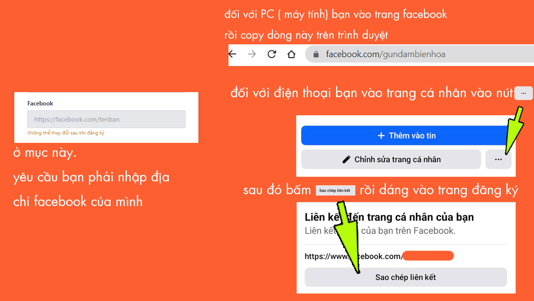 2. ĐỐI VỚI ĐIỆN THOẠI BẠN VÀO TRANG CÁ NHẬN -> BẤM NÚT [...] KÉO XUỐNG PHẦN LIÊN KẾT ĐẾN TRANG CÁ NHÂN BẠN CHỌN [ SAO CHÉP LIÊN KẾT] RỒI DÁN VÀO TRANG ĐĂNG KÝ
